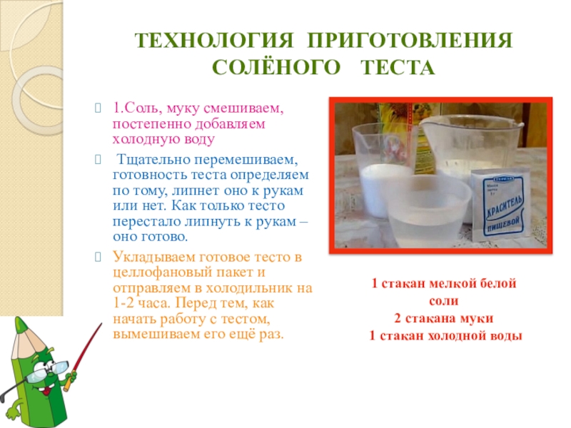 1.Соль, муку смешиваем, постепенно добавляем холодную воду
