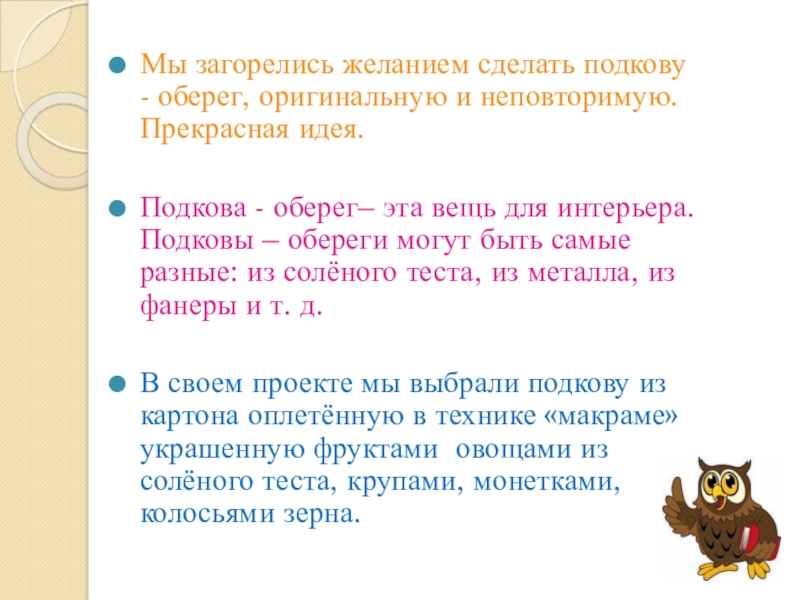 Слайд 11Мы загорелись желанием сделать подкову - оберег, оригинальную и неповторимую. Прекрасная