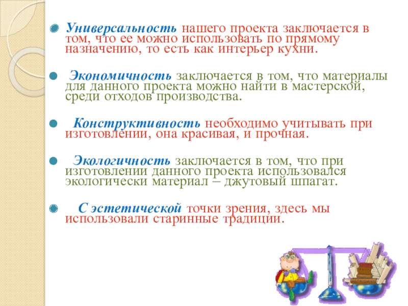 Экологичность заключается в том, что при изготовлении данного проекта использовался экологически материал – джутовый шпагат.