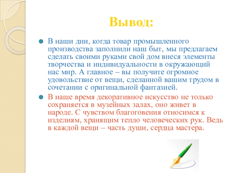В наше время декоративное искусство не только сохраняется в музейных залах, оно живет в народе. С чувством благоговения относимся к изделиям, хранящим тепло человеческих рук. Ведь в каждой вещи – часть души, сердца мастера.
