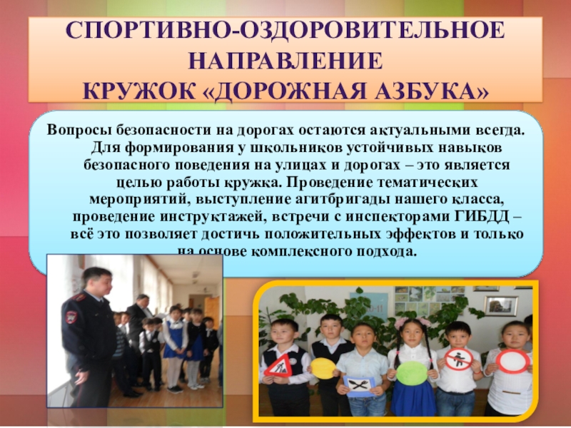 Для формирования у школьников устойчивых навыков безопасного поведения на улицах и дорогах – это является целью работы кружка. Проведение тематических мероприятий, выступление агитбригады нашего класса, проведение инструктажей, встречи с инспекторами ГИБДД – всё это позволяет достичь положительных эффектов и только на основе комплексного подхода.