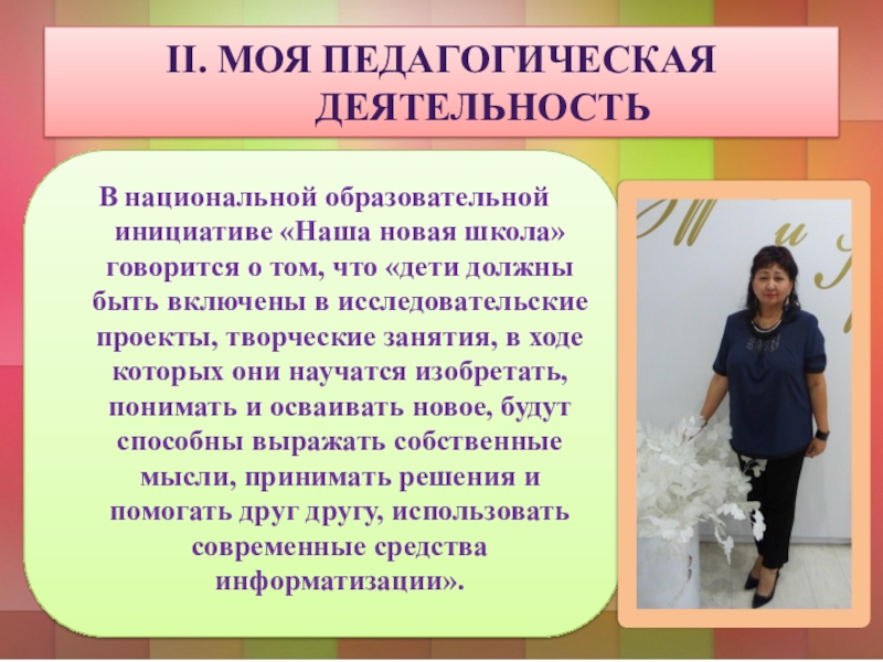о том, что «дети должны быть включены в исследовательские проекты, творческие занятия, в ходе которых они научатся изобретать, понимать и осваивать новое, будут способны выражать собственные мысли, принимать решения и помогать друг другу, использовать современные средства информатизации».