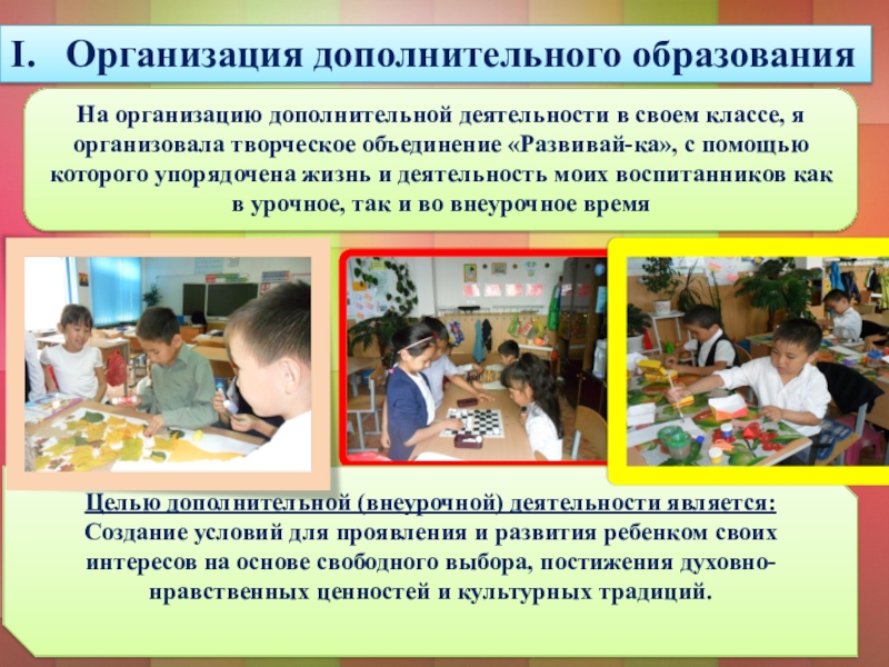 творческое объединение «Развивай-ка», с помощью которого упорядочена жизнь и деятельность моих воспитанников как в урочное, так и во внеурочное время