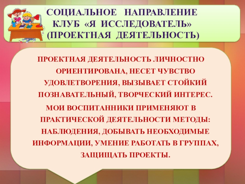 Мои воспитанники применяют в практической деятельности методы: наблюдения, добывать необходимые информации, умение работать в группах, защищать проекты.