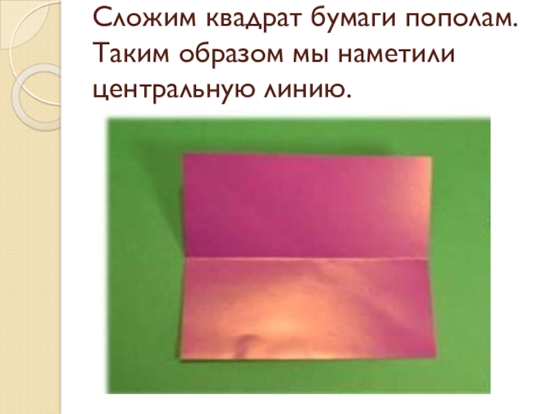 Слайд 14Сложим квадрат бумаги пополам. Таким образом мы наметили центральную линию.