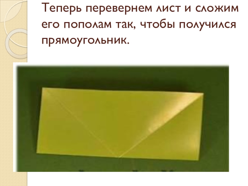Слайд 28Теперь перевернем лист и сложим его пополам так, чтобы получился прямоугольник.
