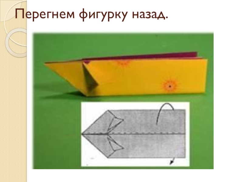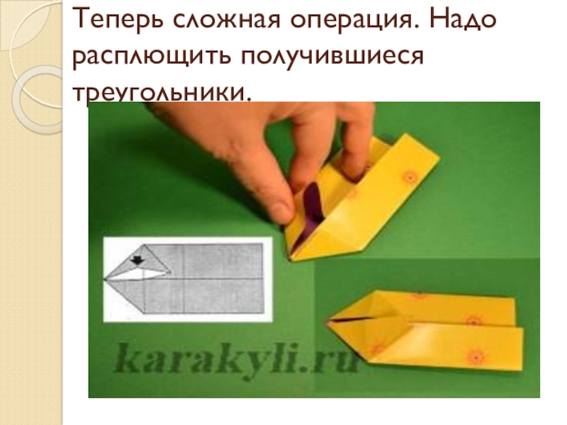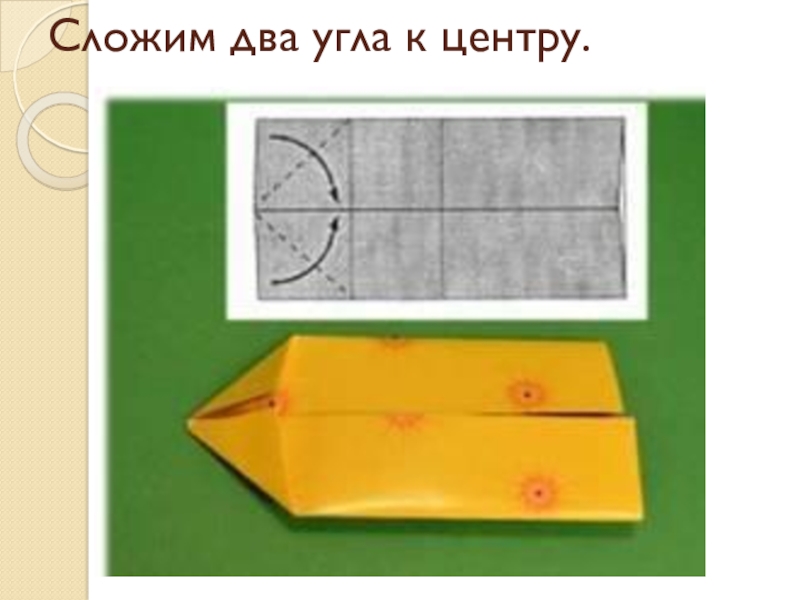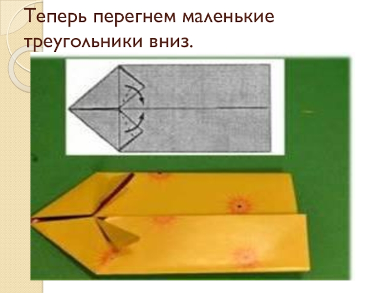 Слайд 19Теперь перегнем маленькие треугольники вниз.