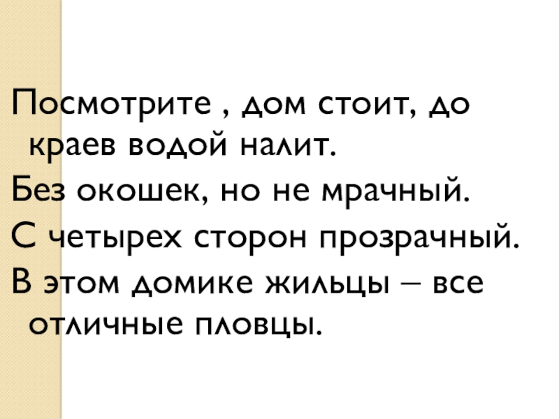 Посмотрите , дом стоит, до краев водой налит.Без окошек, но не мрачный.С четырех сторон прозрачный.В этом домике жильцы – все отличные пловцы.