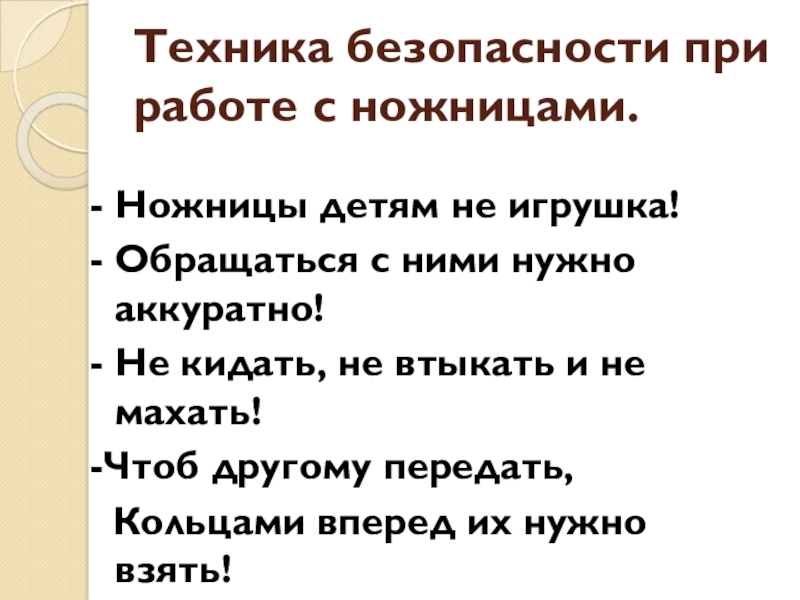 Техника безопасности при работе с ножницами.- Ножницы детям не игрушка!- Обращаться с ними нужно аккуратно!- Не кидать,