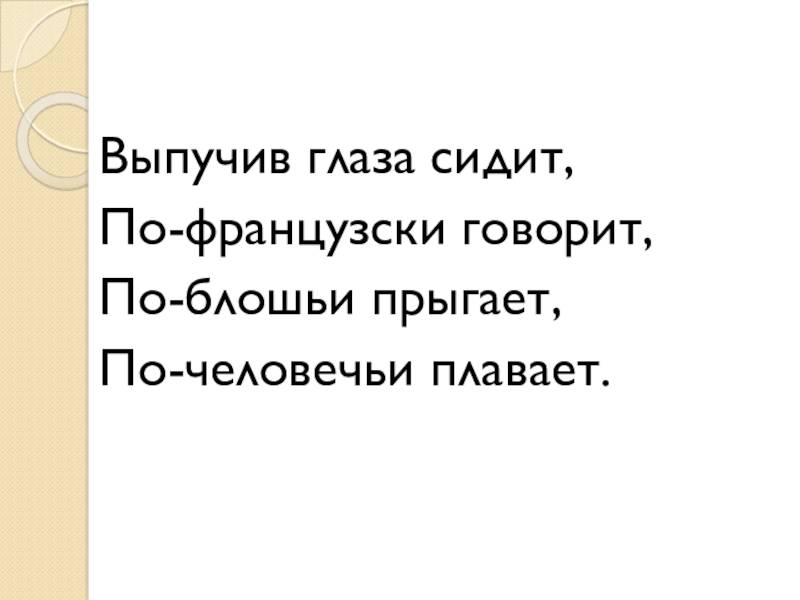 Выпучив глаза сидит,  По-французски говорит,  По-блошьи прыгает,  По-человечьи плавает.