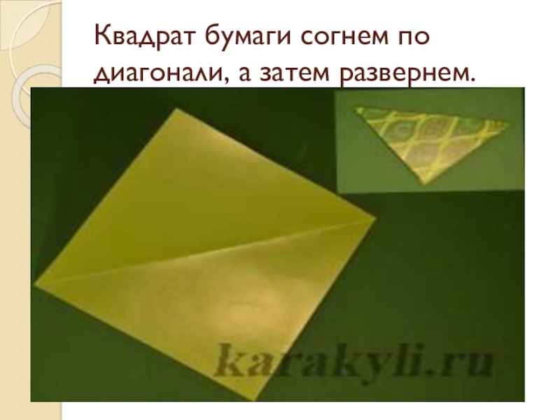 Слайд 26Квадрат бумаги согнем по диагонали, а затем развернем.