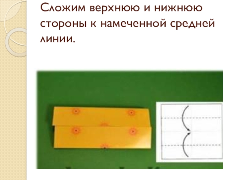Слайд 15Сложим верхнюю и нижнюю стороны к намеченной средней линии.