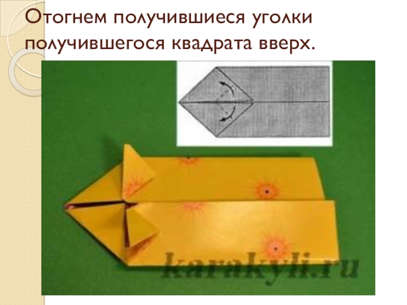 Слайд 18Отогнем получившиеся уголки получившегося квадрата вверх.