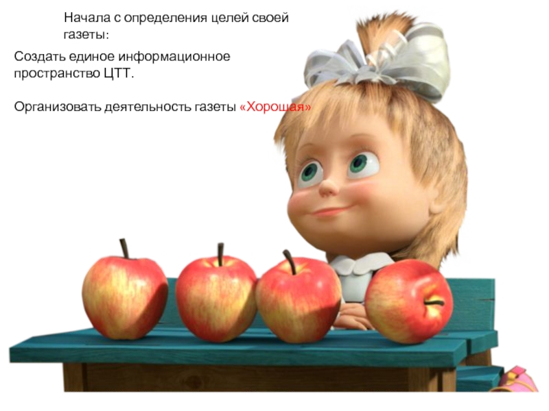 Начала с определения целей своей газеты:Создать единое информационное пространство ЦТТ.Организовать деятельность газеты «Хорошая»