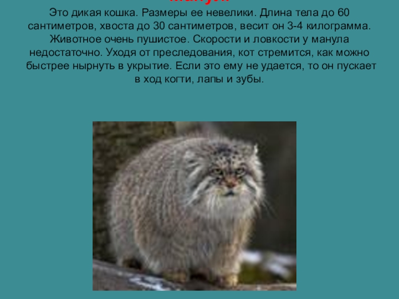 хвоста до 30 сантиметров, весит он 3-4 килограмма. Животное очень пушистое. Скорости и ловкости у манула недостаточно. Уходя от преследования, кот стремится, как можно быстрее нырнуть в укрытие. Если это ему не удается, то он пускает в ход когти, лапы и зубы.