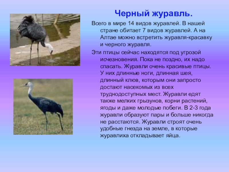 Эти птицы сейчас находятся под угрозой исчезновения. Пока не поздно, их надо спасать. Журавли очень красивые птицы. У них длинные ноги, длинная шея, длинный клюв, которым они запросто достают насекомых из всех труднодоступных мест. Журавли едят также мелких грызунов, корни растений, ягоды и даже молодые побеги. В 2-3 года журавли образуют пары и больше никогда не расстаются. Журавли строят очень удобные гнезда на земле, в которые журавлиха откладывает яйца.