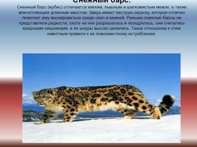 также впечатляющим длинным хвостом. Зверь имеет пеструю окраску, которая отлично помогает ему маскироваться среди скал и камней. Раньше снежные барсы не представляли редкости, охота на них разрешалась и поощрялась, они считались вредными хищниками, а их шкуры высоко ценились. Такое отношение к этим животным привело к их повсеместному истреблению.