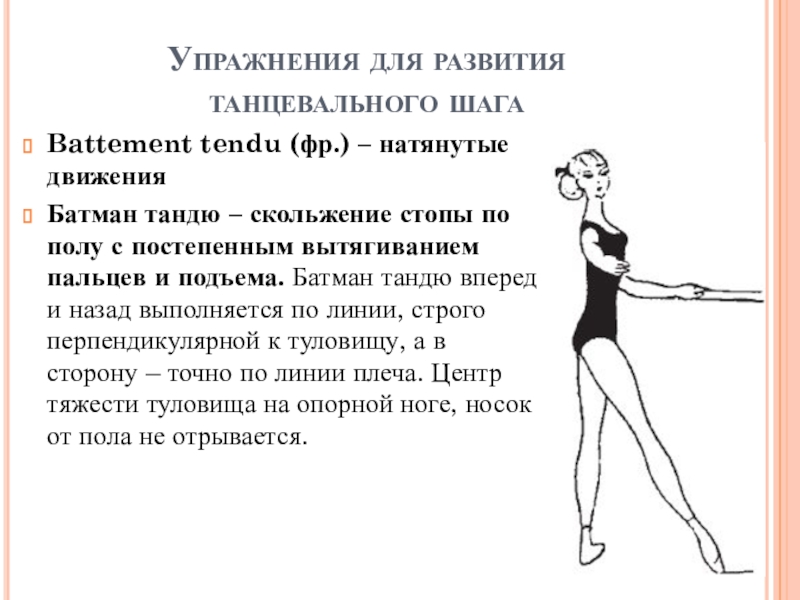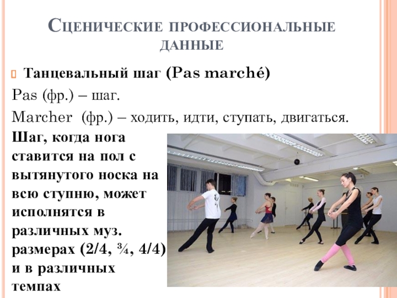 Шаг, когда нога ставится на пол с вытянутого носка на всю ступню, может исполнятся в различных муз. размерах (2/4, ¾, 4/4) и в различных темпах