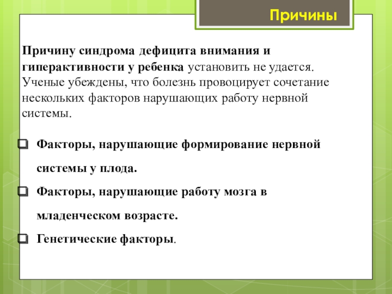 Причину синдрома дефицита внимания и гиперактивности у ребенка установить не удается.