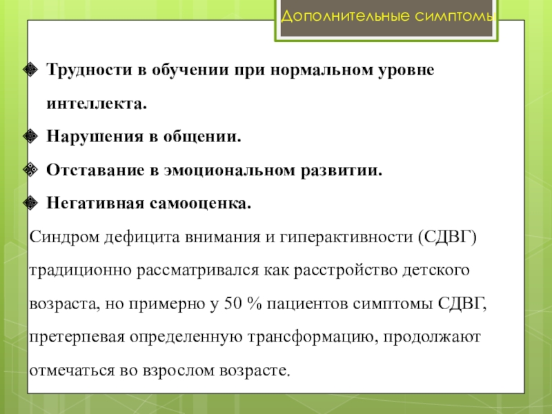 Синдром дефицита внимания и гиперактивности (СДВГ) традиционно рассматривался как расстройство детского возраста, но примерно у 50 % пациентов симптомы СДВГ, претерпевая определенную трансформацию, продолжают отмечаться во взрослом возрасте.