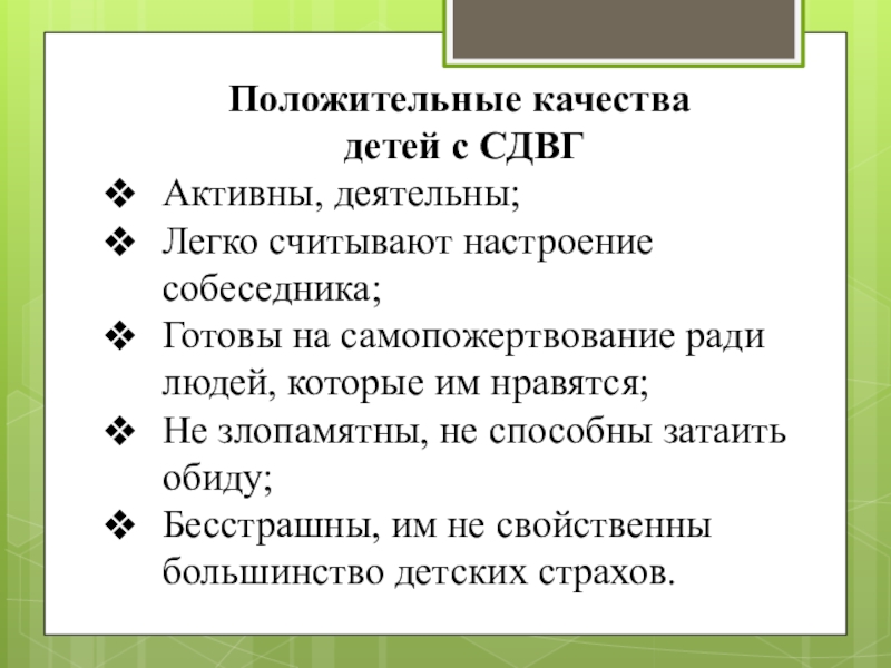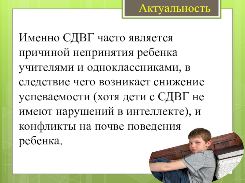 Именно СДВГ часто является причиной непринятия ребенка учителями и одноклассниками, в следствие чего возникает снижение успеваемости (хотя дети с СДВГ не имеют нарушений в интеллекте), и конфликты на почве поведения ребенка.