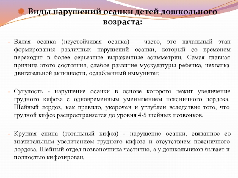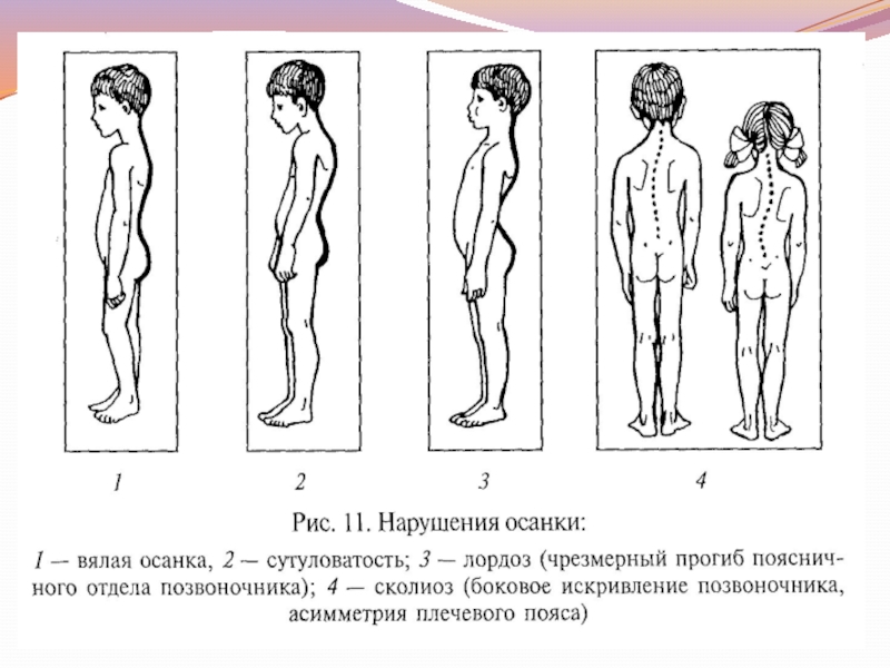 Слайд 2Виды нарушений осанки детей дошкольного возраста: