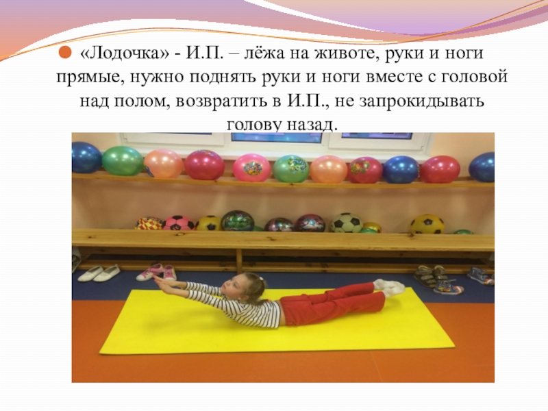Слайд 12«Лодочка» - И.П. – лёжа на животе, руки и ноги прямые,