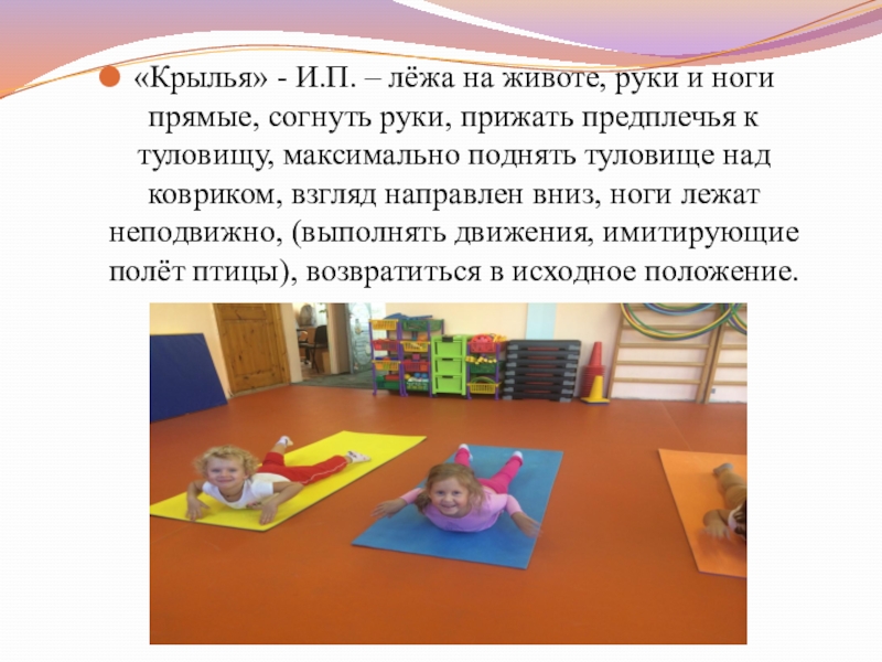 Слайд 15«Крылья» - И.П. – лёжа на животе, руки и ноги прямые,