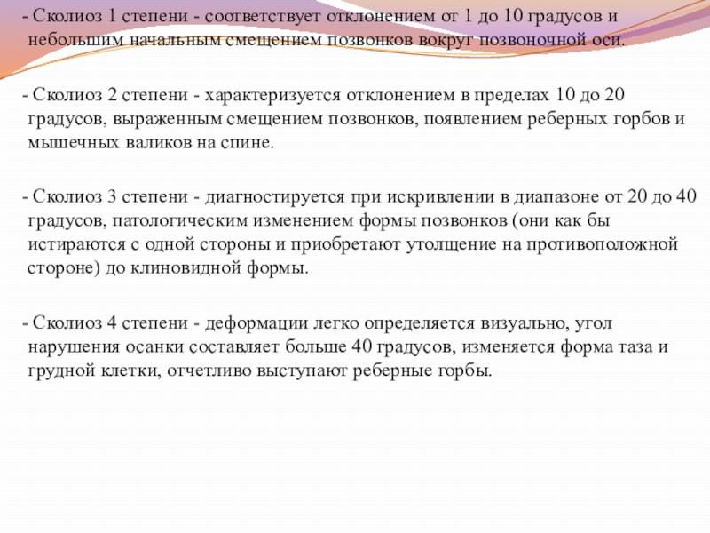 Слайд 4 - Cколиоз 1 степени - соответствует отклонением от 1