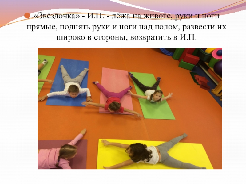 Слайд 14«Звёздочка» - И.П. - лёжа на животе, руки и ноги прямые,