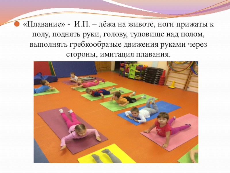 Слайд 13«Плавание» - И.П. – лёжа на животе, ноги прижаты к полу,