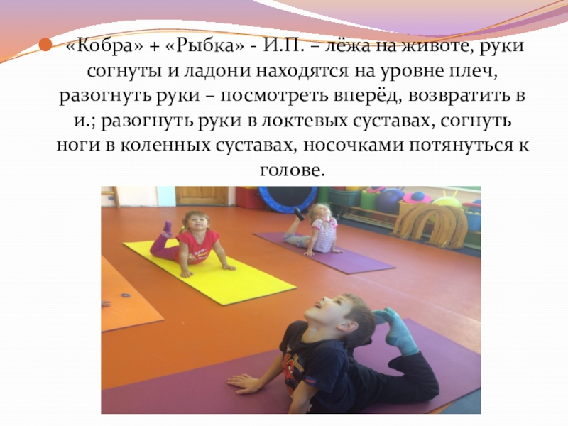 Слайд 16 «Кобра» + «Рыбка» - И.П. – лёжа на животе, руки