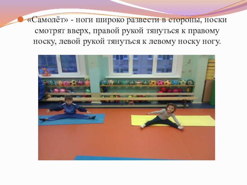 Слайд 8«Самолёт» - ноги широко развести в стороны, носки смотрят вверх, правой