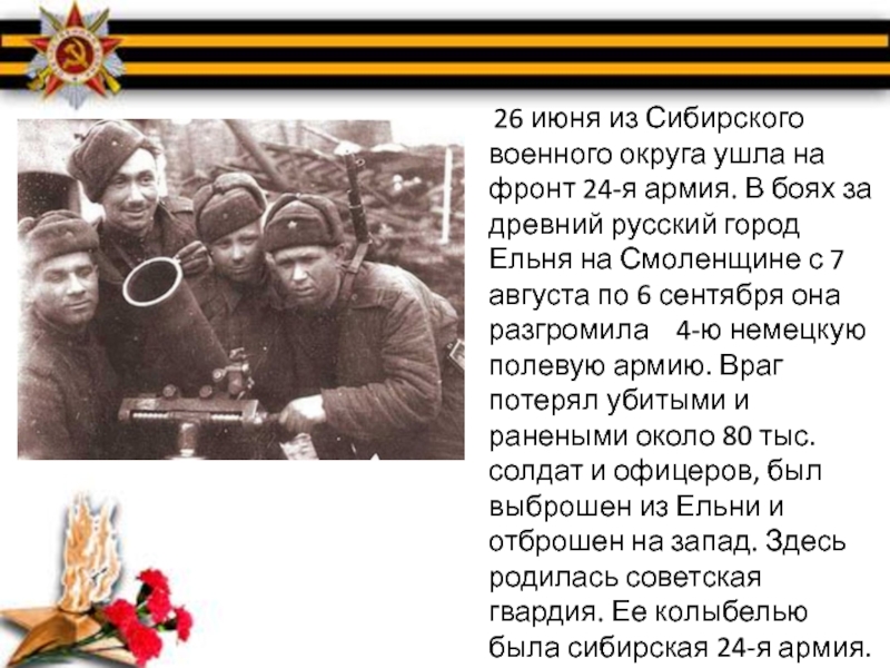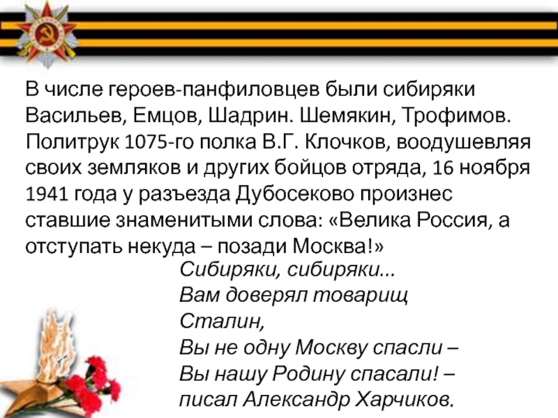 В битвах и сражениях Великой Отечественной войны особое место занимают сибиряки. Сибирские дивизии и полки сражались на всех участках фронта, участвовали в Московской, Сталинградской, Курской и других важнейших операциях.