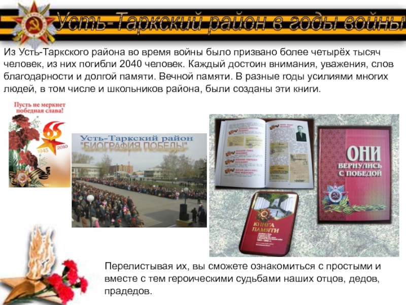 Перелистывая их, вы сможете ознакомиться с простыми и вместе с тем героическими судьбами наших отцов, дедов, прадедов.