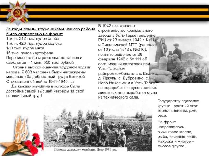 В 1942 г. закончено строительство крахмального завода в Усть-Тарке (решение РИК от 23 января 1942 г. №11) и Силишинской МТС (решение от 13 июля 1942 г. №216), принято решение от 28 февраля 1942 г. № 111 об организации салотопок при Усть-Таркском райпромкомбинате в с. Еланка, д. Яркуль, с. Дубровино, с. Ново-Никольск и в Усть-Тарке по переработке трупов павших животных для выработки мыла из технического сала.