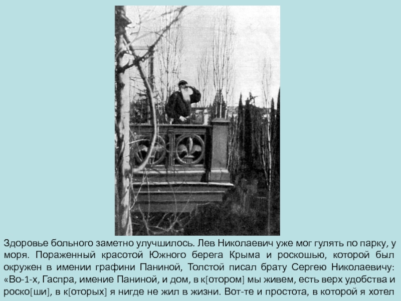 Слайд 21Здоровье больного заметно улучшилось. Лев Николаевич уже мог гулять по парку,