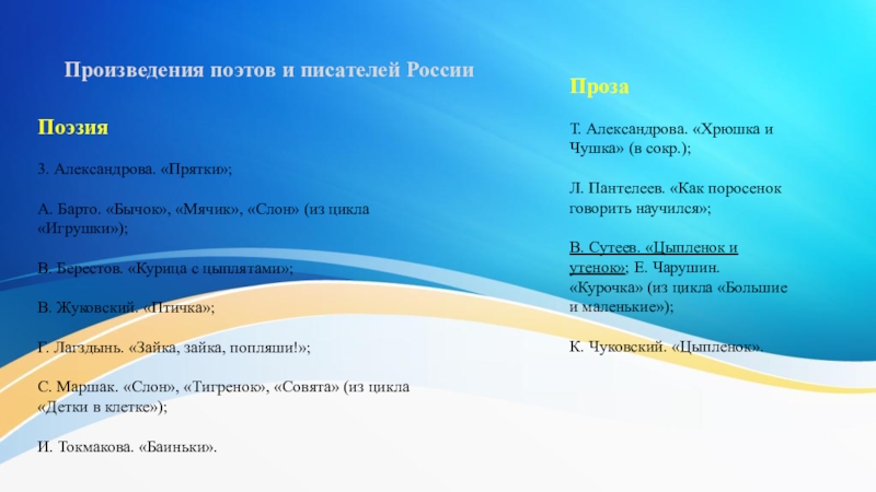 В. Сутеев. «Цыпленок и утенок»; Е. Чарушин. «Курочка» (из цикла «Большие и маленькие»);