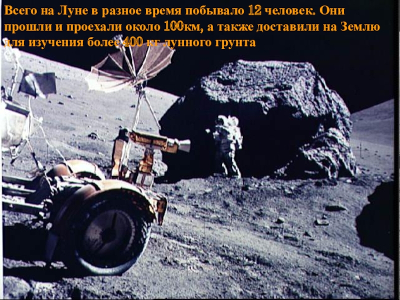 Всего на Луне в разное время побывало 12 человек. Они прошли и проехали около 100км, а также доставили на Землю для изучения более 400 кг лунного грунта