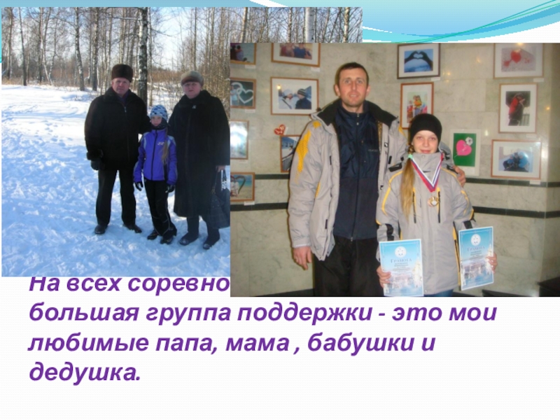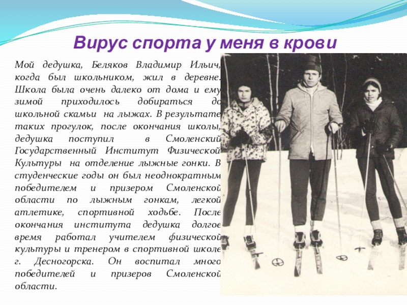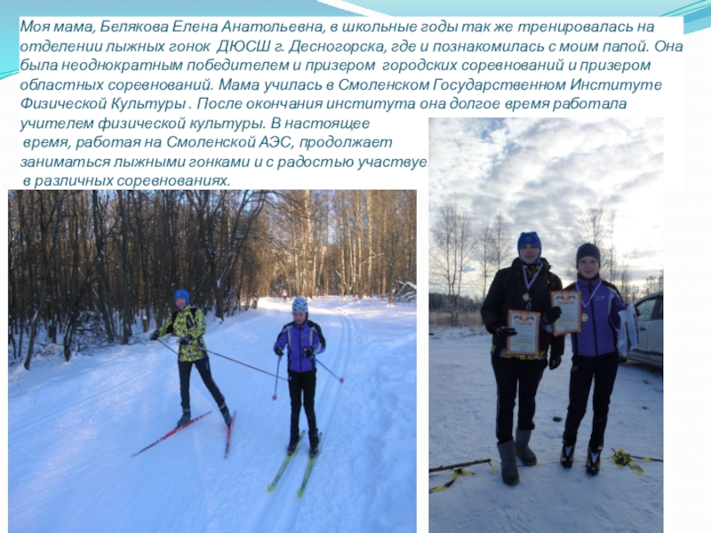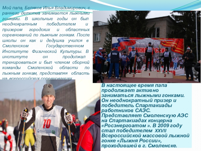 В настоящее время папа продолжает активно заниматься лыжными гонками. Он неоднократный призер и победитель Спартакиады работников САЭС. Представляет Смоленскую АЭС на Спартакиадах концерна «Росэнергоатом ». В 2009 году стал победителем XXVII Всероссийской массовой лыжной гонке «Лыжня России», проходившей в г. Смоленске.