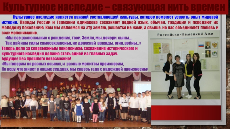 Россия — страна великой культуры, огромного культурного наследия, многовековых культурных традиций и неиссякаемого творческого потенциала.