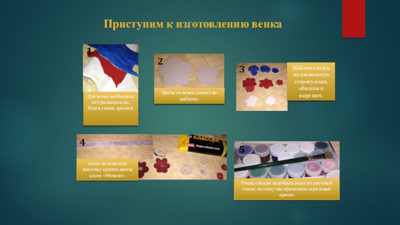 Слайд 9Для венка необходима натуральная кожа, белая, синяя, красная.