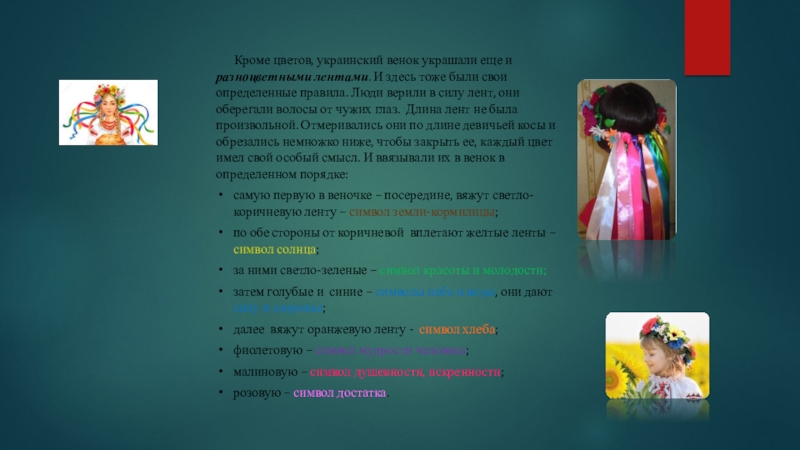 Слайд 6Кроме цветов, украинский венок украшали еще и разноцветными лентами. И здесь