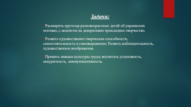Задачи:Расширить кругозор разновозрастных детей об украинских мотивах, с акцентом на декоративно прикладное творчество.Развить художественно творческие способности, самостоятельность