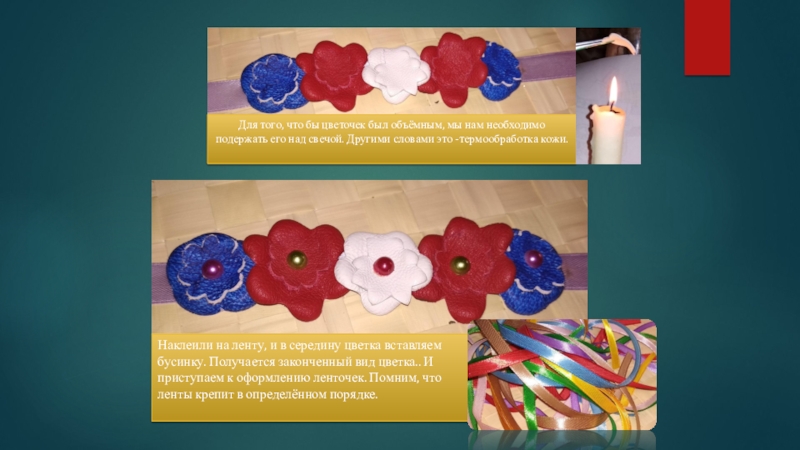 Для того, что бы цветочек был объёмным, мы нам необходимо подержать его над свечой. Другими словами это -термообработка кожи.