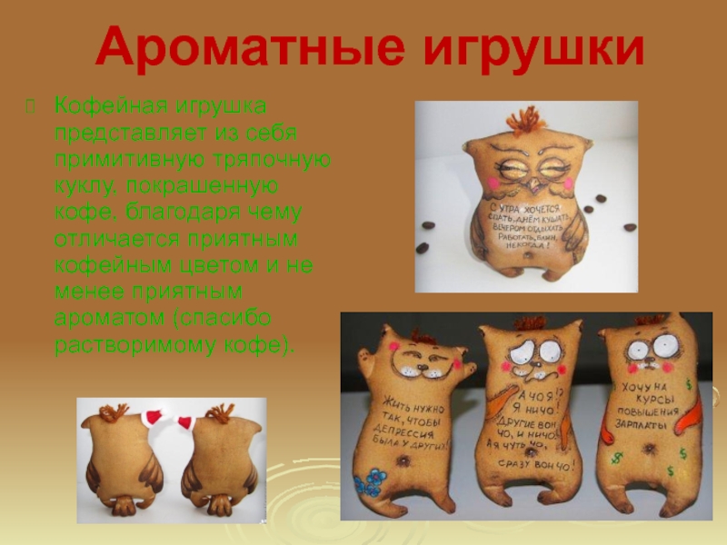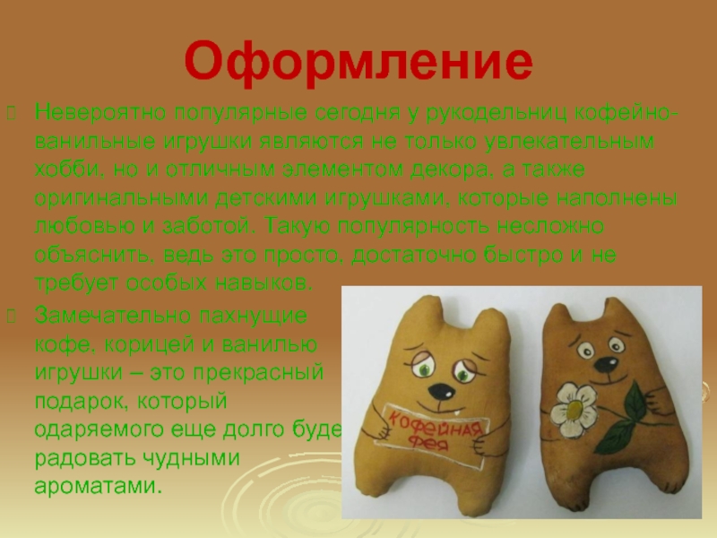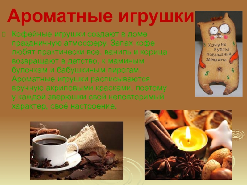 Замечательно пахнущие кофе, корицей и ванилью игрушки – это прекрасный подарок, который одаряемого еще долго будет радовать чудными ароматами.