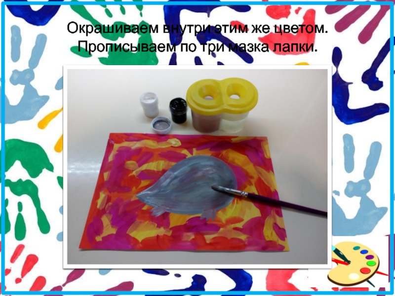 Слайд 5Окрашиваем внутри этим же цветом. Прописываем по три мазка лапки.