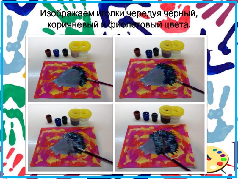 Слайд 6Изображаем иголки чередуя чёрный, коричневый и фиолетовый цвета.