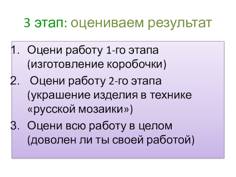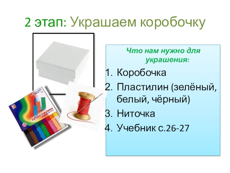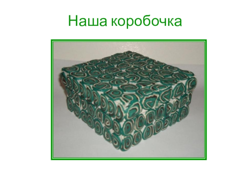 техники, имитирующей « русскую мозаику». Тип занятия: развивающее обучение. Оборудование : цветной пластилин(чёр- ный, белый, зелёный), коробочка для украшения, ниточка, клеёнка на стол.