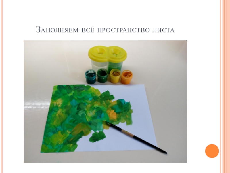 Плоской кистью в разных направлениях, используя зелёный (тёплый и холодный) и жёлтые цвета наносим крупные мазки.